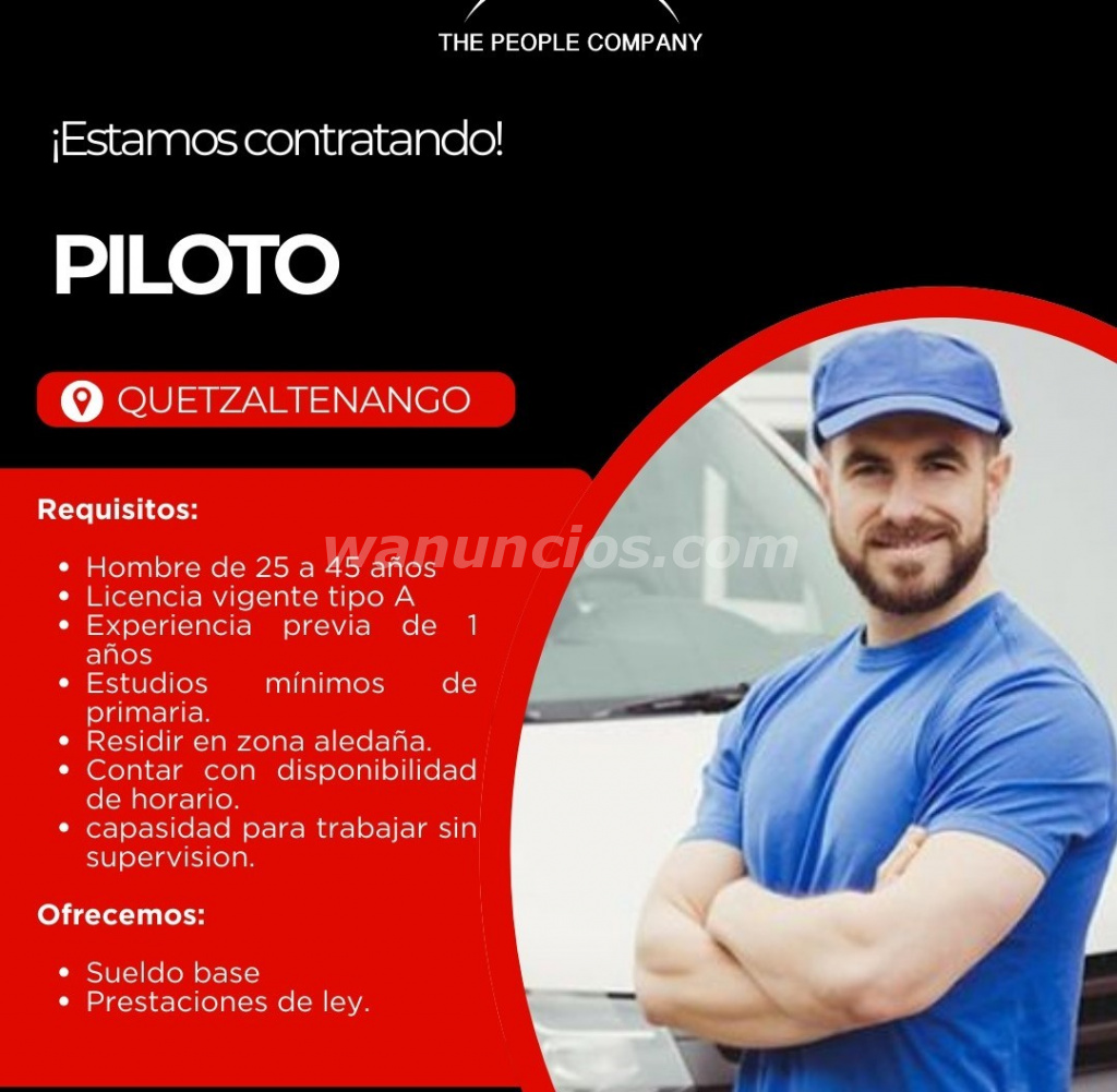 PILOTO CON LICENCIA TIPO A, SALARIO MENSUAL DE 7,000.00 MAS BONIFICACION DE LEY, INTERESADOS COMUNICARSE AL TEL. 39465670